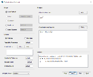 Figures 4.9.2(b, c) respectively show the Optimization Assistant finding the minimum of zero at 4,0, and the maximum of 16/3 at 4/3,2.