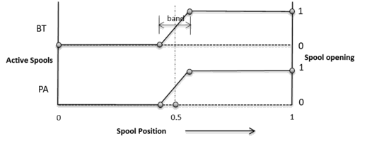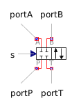 The DCV 42 CP component is a 4-way 2-position valve. The area between pairs of ports varies as a function of the spool input signal, s, and the parameters Amax, Amin, and band. The following table gives the areas for two values of the spool input.