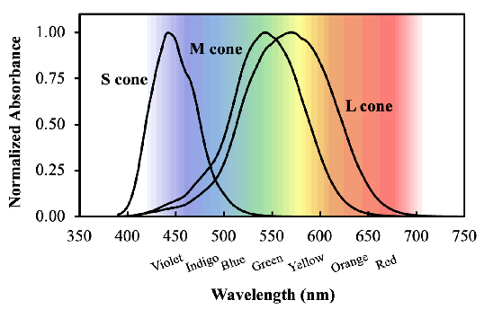 The plot below shows the wavelengths at which each cone cell absorbs.