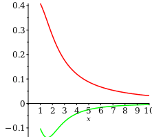 On the basis of this graph, it may be conjectured that f is monotone decreasing and bounded below by zero, provided x≥1. (The derivative appears to be negative for x>1.)