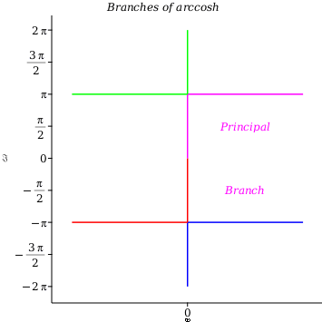 branches can use one of two methods to indicate how closure on the branch cut(s) of the function f is defined: color or curve thickening. The default is to use color.  In this case, boundary curves of the same color belong to the same range.  This is usually sufficient to deduce the closure.  In addition, the principal branch of the function is labeled in the same color as its boundary.