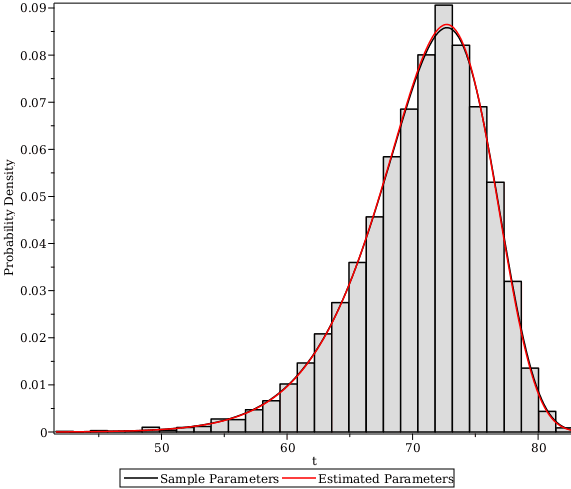 plotopts:=axesfont=Calibri,labelfont=Calibri,labels=t,Probability Density,labeldirections=horizontal,vertical:p1≔HistogramData,color=Gainsboro,plotopts:p2:=plot⁡Pt,α,β,t=sort⁡Data1..sort⁡Datan,color=Black,legend=Sample Parameters,plotopts:p3:=plot⁡P⁡t,α__GOT,β__GOT,t=sort⁡Data1..sort⁡Datan,color=Red,legend=Estimated Parameters,plotopts:display⁡p1,p2,p3,size=800,golden