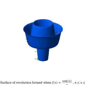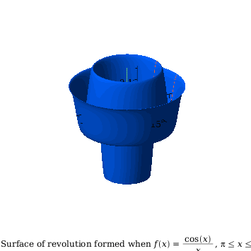 SurfaceOfRevolution1xcosx,π..4π,output=plot,axis=vertical,distancefromaxis=π