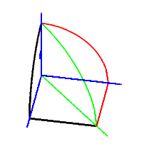 use plots,plottools in module() local a,s1,s2,s3,p1,p2,p3,p4,p5,p6,p7,k; s1 := [seq([k/30,0,sqrt(1-(k/30)^2)],k=0..30)]: s2 := [seq([k/30,k/30,sqrt(1-(k/30)^2)],k=0..30)]: s3 := [seq([0,k/30,sqrt(1-(k/30)^2)],k=0..30)]: p1 := spacecurve({s1,[1,y,0,y=0..1]}, color=black, thickness=3): p2:=spacecurve([x,x,0,x=0..1.2],color=green,thickness=2): p3:=spacecurve(s2,color=green,thickness=2): p4 := spacecurve({[x,1,0,x=0..1],s3}, color=red, thickness=2): p5 := spacecurve({[[1.2,0,0], [0,0,0], [0,1.2,0]], [[0,0,0], [0,0,1.2]]}, color=blue, thickness=2): p6:=display([p1,p2,p3,p4,p5], labels=[x,y,z], scaling = constrained, axes=none); a:=.1; p7:=animate(display,[parallelepiped([a,0,0],[0,b,0],[0,0,a],[b,0,.4])],b=0..1,view=[0..1.2,0..1.2,0..1.2],labels=[x,y,z],orientation=[10,50,0],paraminfo=false,scaling=constrained,background=p6,tickmarks=[3,3,5]); print(p7); end module: end use: