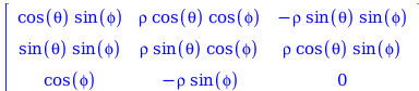 ∂∂ ρ X∂∂ φ X∂∂ θ X∂∂ ρ Y∂∂ φ Y∂∂ θ Y∂∂ ρ Z∂∂ φ Z∂∂ θ Z = →determinantcos⁡φ2⁢sin⁡θ2⁢sin⁡φ⁢ρ2+cos⁡φ2⁢cos⁡θ2⁢sin⁡φ⁢ρ2+sin⁡θ2⁢sin⁡φ3⁢ρ2+cos⁡θ2⁢sin⁡φ3⁢ρ2= simplify sin⁡φ⁢ρ2