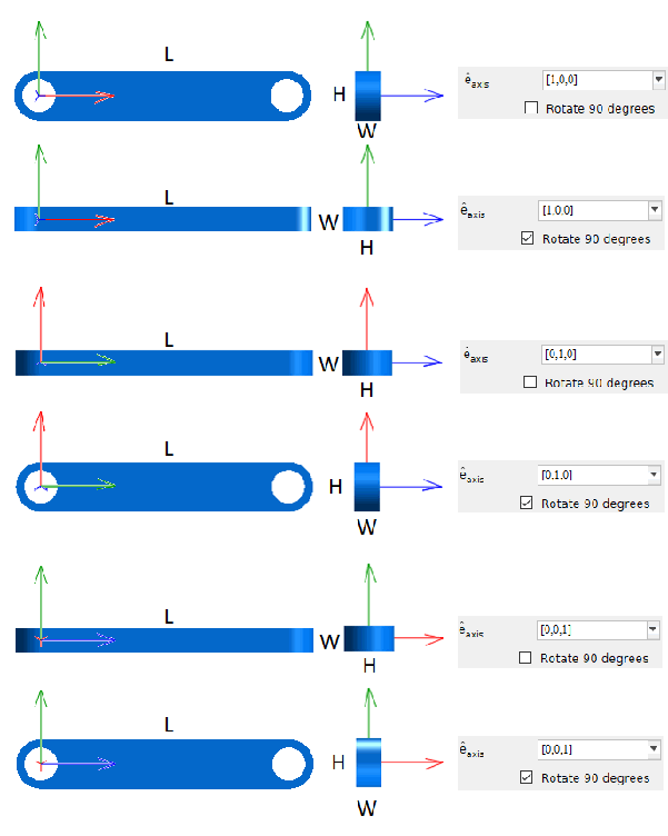 Linkage length (L) is always along the specified axial unit vector (e_axis). Unit vectors for width (W) and height (H) are defined according to Figure 1. The sequence depends on whether or not the Rotate 90 degrees option is checked (true). The two end holes are always along the width axis.