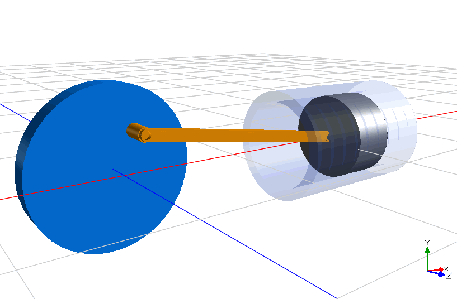 In this example, a Linkage, a Disk, and two Cylinder components are connected with revolute and prismatic joints, as shown in Figure 6, to model a slider-crank mechanism. This model is similar to the one discussed in the Cylinder and Disk help pages with the difference of using a Linkage component to connect the crank to the slider.