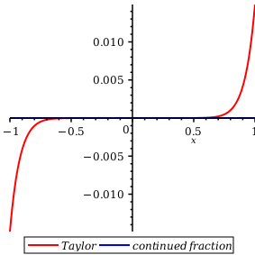 plottanx−s,tanx−c5,x=−1..1, legend=Taylor,continued fraction,thickness=2,color=red,blue