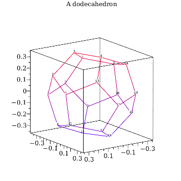 The graphplot3d routine draws a graph G=(V,E) in 3-dimensional space. It computes the eigenvectors e1, e2, e3, e4,... of the adjacency matrix of the graph G and locates the vertices of G in R^3 by locating the jth vertex in G at (x, y, z) co-ordinates (e2[j], e3[j], e4[j]). This construction recovers symmetric spatial arrangements for graphs in R^3 from the adjacency information only. For example,