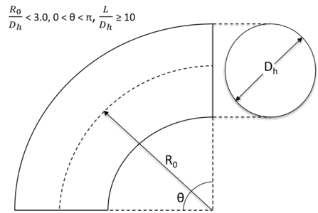 The Pipe Bend component models a circular pipe with losses caused by the bending of flow. The pressure drop is computed with the Darcy equation, with the friction factor determined using the Haaland approximation for turbulent flow along with correction factors due to the bend which contributes to the total resistance to the flow inside the pipe.
