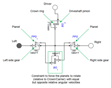 The differential model uses two Planet Planet Gear components and two Basic Gear components as shown in the diagram below.