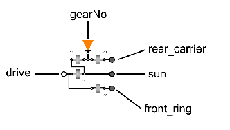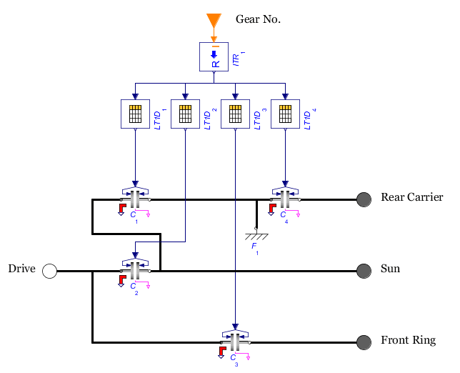 The Simpson Actuation component is intended for use with a Simpson Gear Set (see Simpson Gear). The internal structure of this component is shown below. The combination of the clutches and the activation table, enables the user to easily create a 3-Speed Simpson Gearbox.