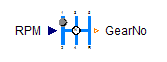 The Gear Shifter component automatically changes the gear for use with various gearboxes in the Driveline Component Library. The gear number (output) is incremented by 1 when the engine RPM (input) passes the upper threshold (ωhigh). Similarly, when the engine RPM goes below the lower threshold (ωlow), the gear number is decremented by 1.