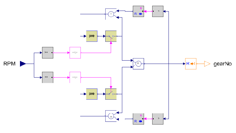 Note: To avoid multiple gear shifts due to small variations in the engine RPM, pass the input signal through a Lowpass Butterworth filter first.