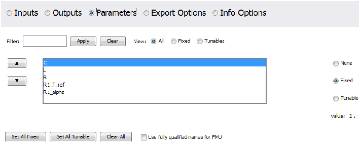 Note: If the parameters are not marked for export they will be numerically substituted. Parameters marked as tunable will also be marked for export by default. However, tunable parameters will be ignored if FMI Version and Environment (see Step 3: Export Options) are anything other than FMI 2.0 and Co-Simulation. To use fully qualified parameter names for the generated FMU, check the corresponding check box; otherwise, short parameter names will be used by default.