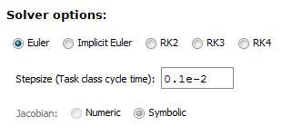 For the Implicit Euler (stiff) solver, you can select between a symbolic or numeric approximation to the system Jacobian.