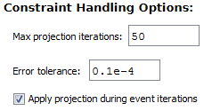 The Constraint Handling Options specifies whether the constraints are satisfied in a DAE system by using constraint projection in the generated C code. Use this option to improve the accuracy of a DAE system that has constraints. If the constraint is not satisfied, the system result may deviate from the actual solution and could lead to an increase in error at an exponential rate.
