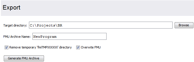 To generate an FMU archive click Generate FMU Archive. The file is saved to the target directory.