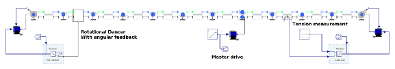 The sublibrary Drives And Controls of the Web Handling library allows the user to easily create tension control loops for an R2R (roll-to-roll) web line. The components can be used with a direct tension measurement as well as with a feedback from a rotational or a linear dancer. Each tension controller has a local web speed as an output signal which changes the line speed to develop tension in the web line.