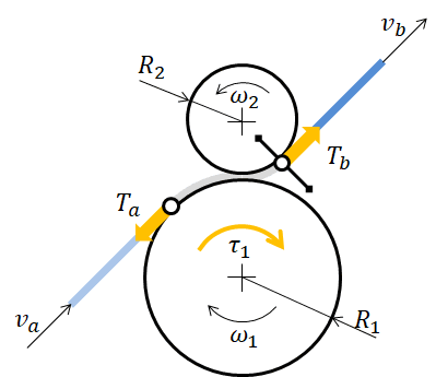 1R1⁢J1⁢dω1dt+1R2⁢J2⁢dω2dt+b⁢1R1⁢ω1+1R2⁢ω2={1R1⁢τ1−Ta+TbSide=11R2⁢τ2−Ta+TbSide=2