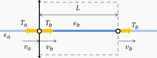 Consider a portion of the web between two boundaries a and b (i.e. a control volume). Assume the web velocity goes through a discontinuous change at the left (entry) boundary.