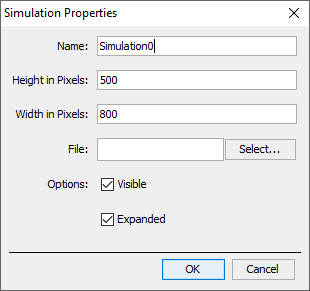 Click Select and browse to the model you want to open and click Open. The File field of the Simulation Properties window is populated with the file path of the model.