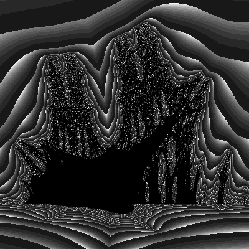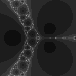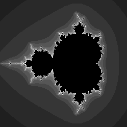 Each of the four computational commands below generates three 400x400 pixel images. The first two grayscale images are Arrays, which store information about how many iterations of the relevant iterative map it takes from each starting point for the absolute value to exceed a tolerance (e.g. "escape") and what its final absolute value may be. Each color image is produced by combining the two grayscale layer Arrays to compute an Array with three color layers.