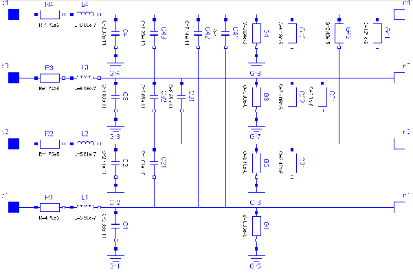 The Multiple OLine (or M OLine) component models coupled lossy transmission lines. It consists of several segments and several coupled single lines. Each segment consists of resistors and inductors that are connected in series in each single line, and of capacitors and conductors both between the lines and to the ground. The inductors are coupled to each other like in the M Transformer model. The following diagram shows the schematic of a segment with four single lines (lines=4):
