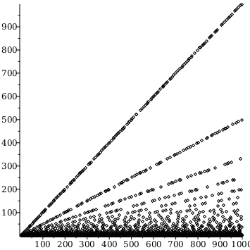 plots:-pointplot⁡`union`⁡seq⁡map⁡p↦n,p,PrimeFactors⁡n,n=1..1000