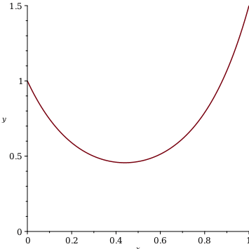 It can be shown that for a sufficiently idealized wire cable of length c, hanging between two supports at x1,y1 and x2,y2 in a vertical xy-plane, the equation describing the shape of the cable is of the form yx=k coshd+x/k−λ, with c constrained by the equation c=k sinhd+x2/k−sinhd+x1/k. In this context, the curve is called a catenary, from the Latin catina (chain). If such a cable of length c=2 hangs between the points 0,1 and 1,3/2, find the equation of the resulting catenary, and draw its graph.