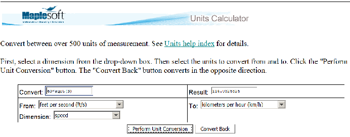Converting this to kilometers per hour gives 114.033 km/h, where Maple's Units Calculator Assistant, as per Figure 3.10.5(a), was used.