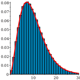 S:=Sample⁡NonCentralChiSquare⁡5,5,100000:P1≔HistogramS,range=0..30,maxbins=100:P2:=DensityPlotNonCentralChiSquare⁡5,5,range=0..30,thickness=3,color=red:plotsdisplayP1,P2