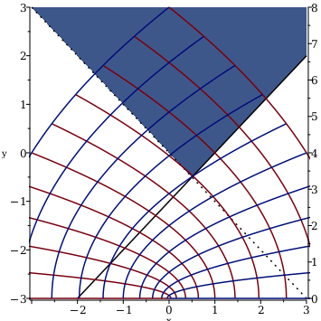 dualaxisplotinequal0<x+y&comma;xy1&comma;x=3..3&comma;y=3..3&comma;optionsexcluded=color=white&comma;conformalz2&comma;z=0..2+2I